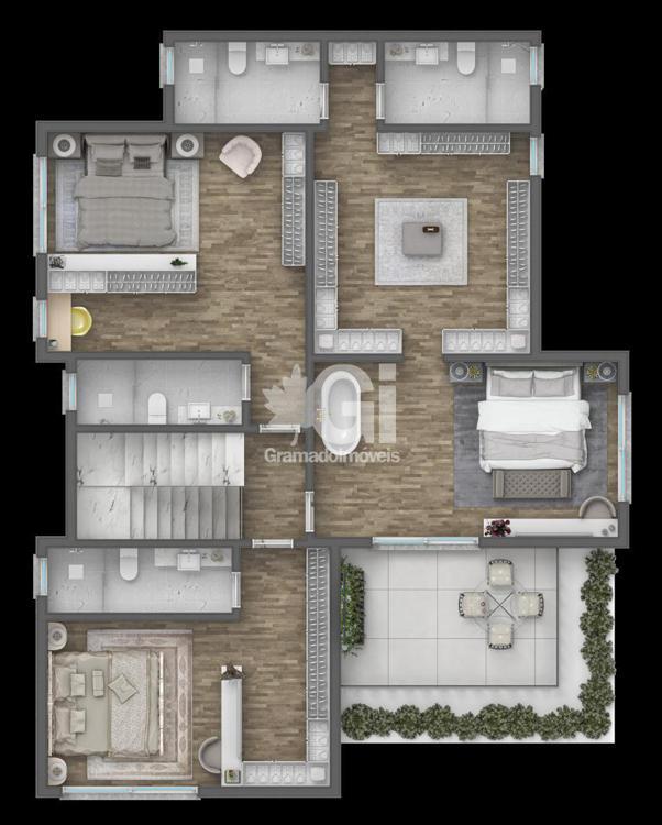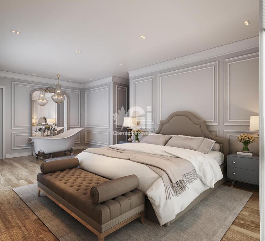 A suíte master destaca-se pela sua opulência, oferecendo um closet espaçoso, banheiros individuais para ele e ela, uma banheira de imersão integrada ao quarto e uma sacada privativa. As áreas de convivência são amplas e sofisticadas, abrangendo um living com lareira, sala de TV, sala de jantar, cozinha americana com churrasqueira, lavabo e lavanderia.