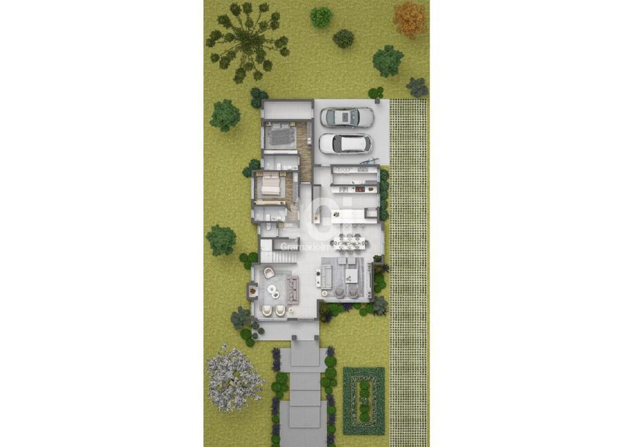 A propriedade apresenta cinco suítes, incluindo duas no pavimento térreo, e uma garagem coberta para dois automóveis com instalação preparada para carregador de carro elétrico.